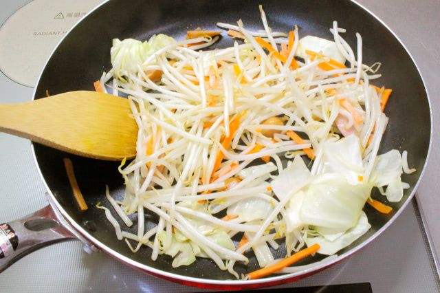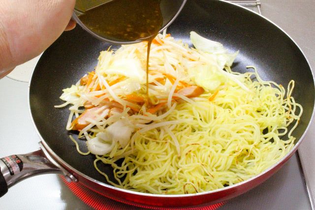 炒める前に焼きそば麺をレンチンしておくと、ほぐれやすくなりますよ。