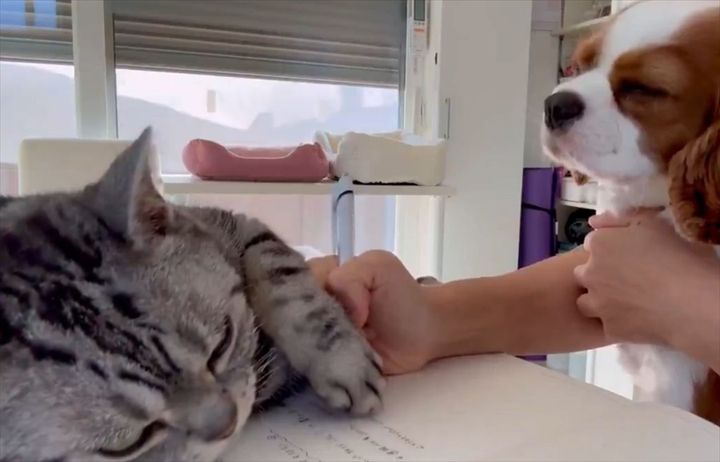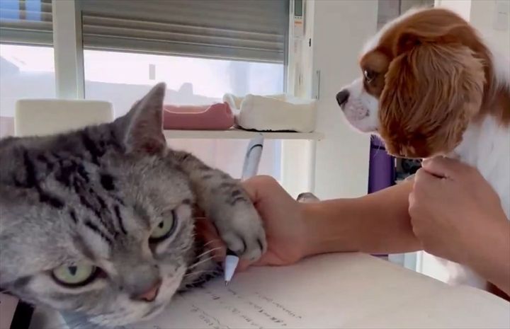 愛猫にペンを持つ手を押さえつけられていた飼い主さん。 その時の様子が反響を呼んでいます!