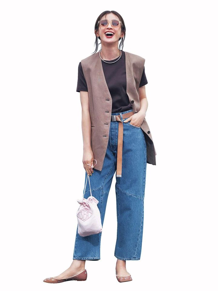 ジレ¥57,200(サクラ/インターリブ) Tシャツ¥5,280(ミラ オーウェン/ミラ オーウェン ルミネ新宿2店)デニムパンツ¥24,200(ローラス/ジャック・ オブ・オール・トレーズ プレスルーム) バッグ¥19,800(シー/エスストア) シューズ¥39,600(ピッピシック/ベイジュ)ベルト¥9,900(ハァウ/ウィム ガゼット 玉川髙島屋S・C店)ピアス¥25,300(マリハ)ネックレス¥86,900(ニナ・エ・ジュール/ショールーム ロイト)サングラス¥40,700(ブラン/ライト)