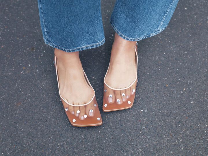 Tシャツ×デニムを知的に昇華。足元には、ペディキュアが ほんのり透けるシアー&スクエアで抜け感を。