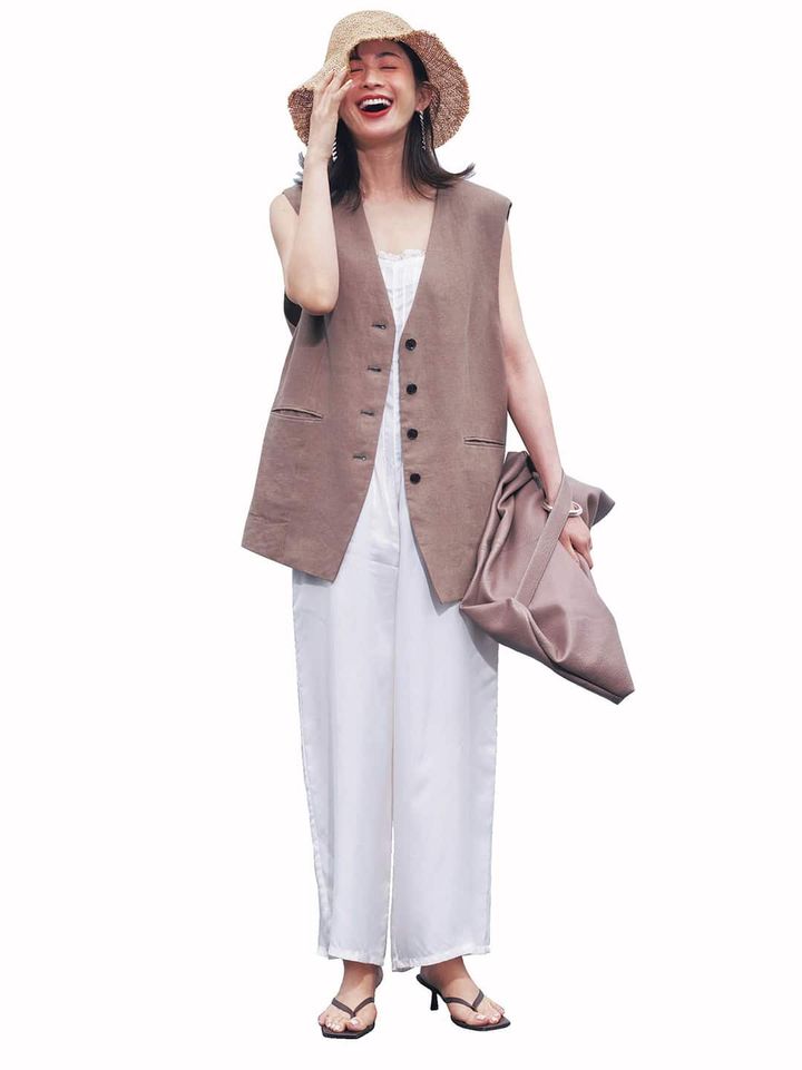涼しげサロペをキリッと引き締め。サラッとした着心地のゆるサロペに凛としたジレの直線ラインを。メイクは目の下幅広にコーラルチークを入れてヘルシーに仕上げれば、バカンスな表情に。