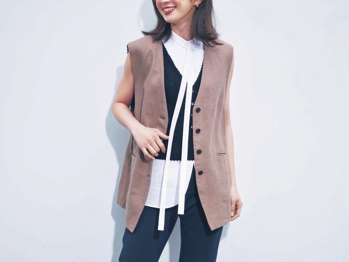 ジレ¥57,200(サクラ/インターリブ) ニットベスト¥38,500(コルデラ/シンゾーン ルミネ有楽町店)ブラウス¥33,000(デパリエ/デパリエ 伊勢丹新宿店)パンツ¥38,500(シー/エスストア)バッグ¥68,200(メゾン カナウ/ヤマニ) パンプス¥97,900(ペリーコ/アマン) ピアス¥29,700(リューク)