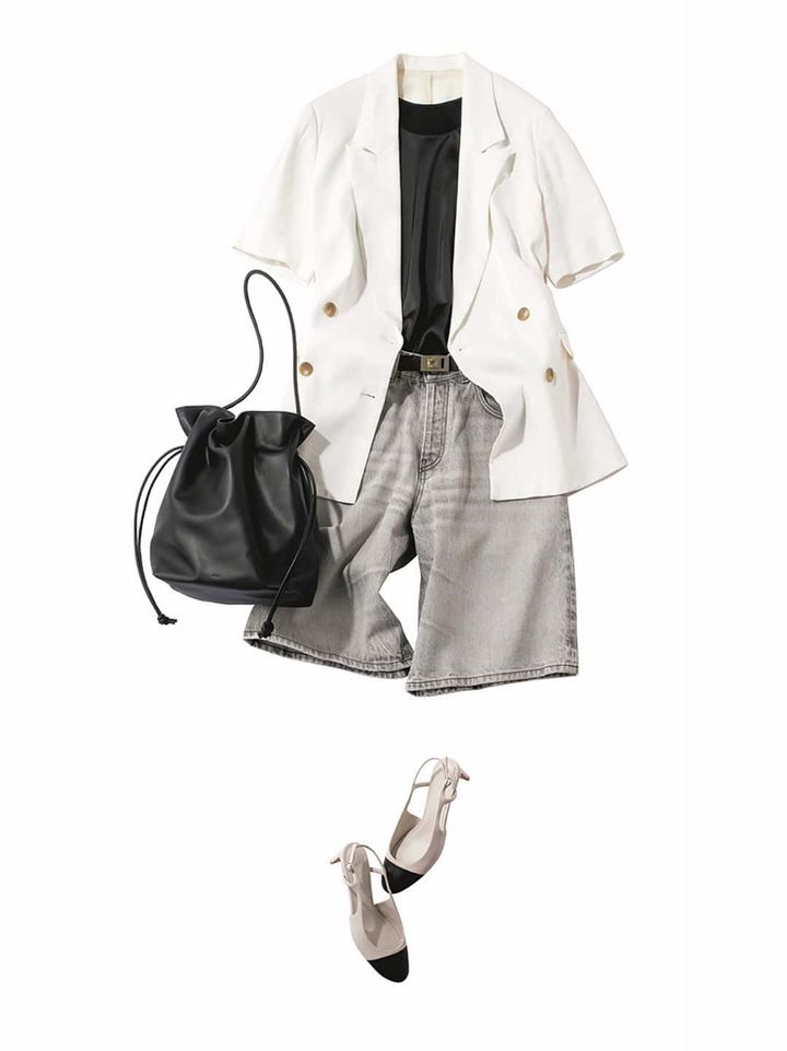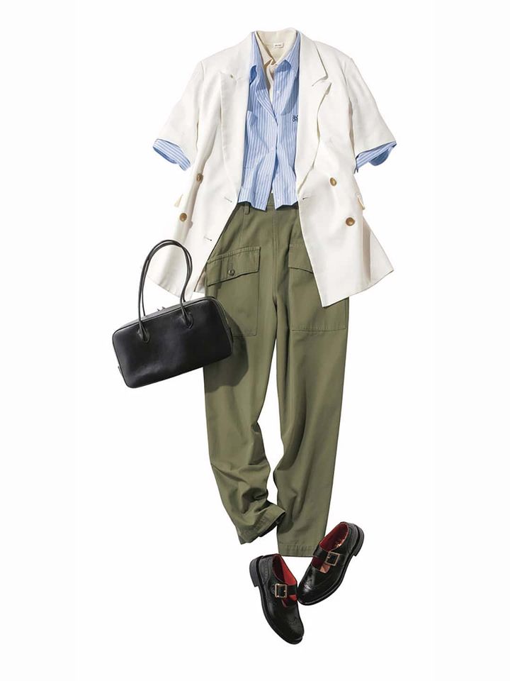 Tシャツ×パンツの定番スタイルに 体が泳ぐビッグJKを羽織ったエフォートレスなお仕事スタイル。クリーンな白なら涼しげ&軽やか!