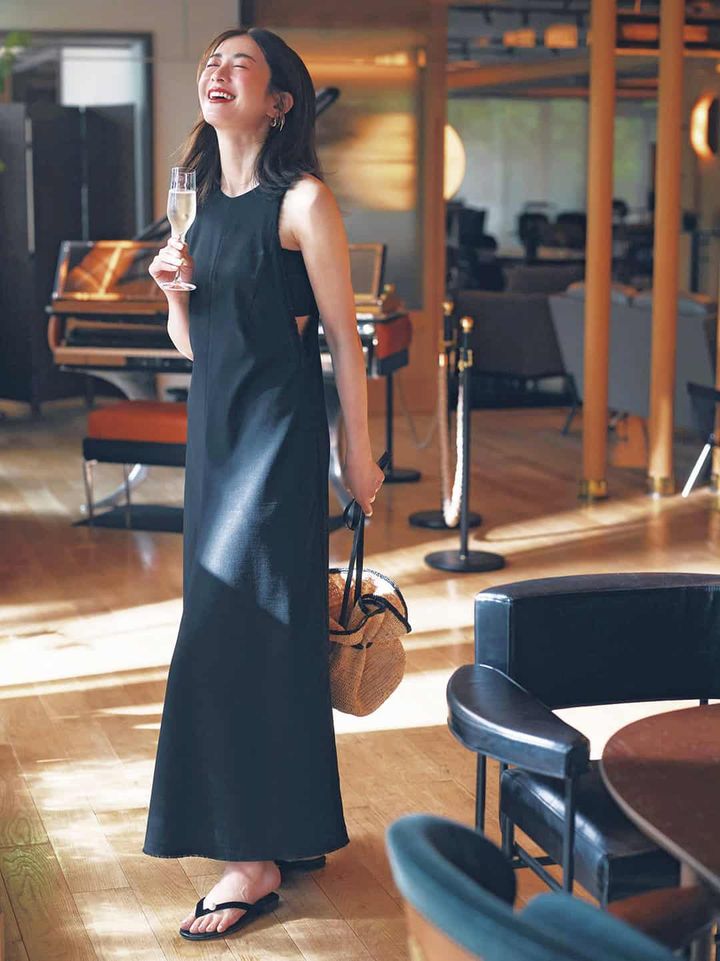 肌見せのオシャレが楽しめる季節だからこそ、 大人はシーンによって面積の調整を。ざっくり開いた脇部分からチラ見えするブラトップや極細ストラップなど、微差の女らしさにこだわって。