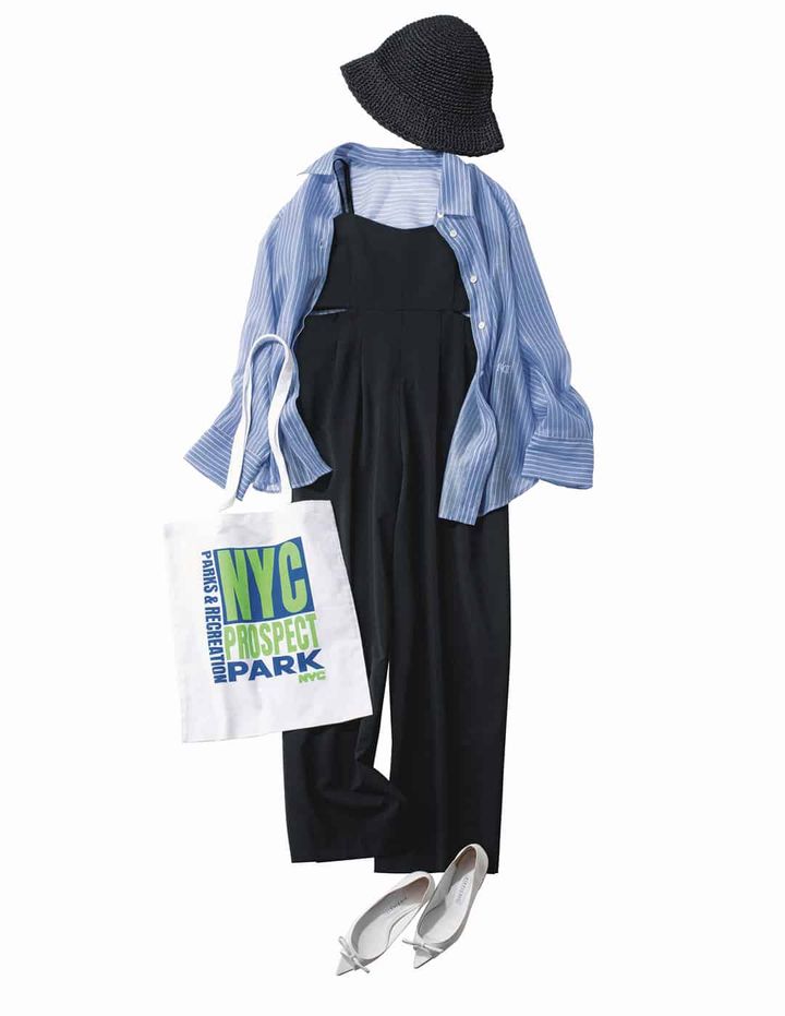 オーガンジーシャツ¥19,910(FRAY I.D/FRAY I.D ルミネ新宿2店)サロペット¥46,200(アルアバイル)バッグ※ 参考商品(グッドスピード)パンプス¥37,400(ピッピシック/ベイジュ)ハット¥25,300(ザ シンゾーン/シンゾーン ルミネ有楽町店)