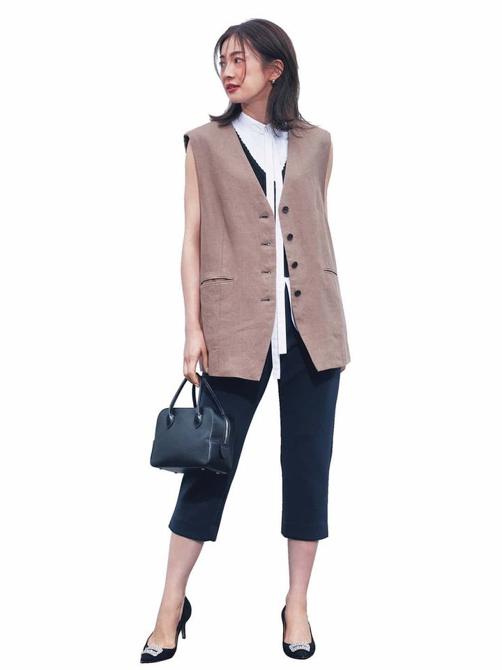 ノースリ同士を重ねて感度高めに。まだまだ暑いけど暦の上では秋、そんな端境期はブラウス、ベスト、ジレのレイヤードで、秋の香りを漂わせて。黒のチラ見せがレイヤードコーデの程よいアクセントに。