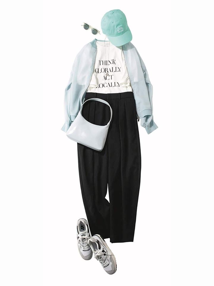 パンツ¥25,300(カレンソロジー/カレンソロジー二子玉川) ブルゾン¥66,000(タトラス/タトラス 日本橋店)Tシャツ¥4,500(Mila Owen/Mila Owen ルミネ新宿2店)バッグ¥13,970(スタンドオイル/ル タロン 有楽町マルイ店)スニーカー¥ 19,800(ニューバランス/ニューバランスジャパンお客様相談 室)キャップ¥4,620(ニュー エラ)サングラス¥101,200(10 アイヴァン/アイヴァン PR) ネックレス¥30,800(マリハ)