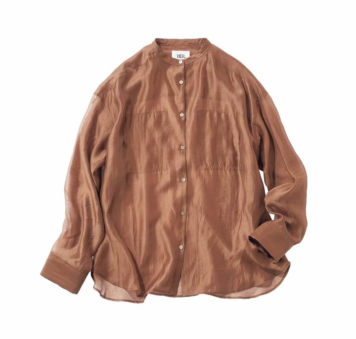 夏でも涼しくいられるシアーシャツは、老け見えしない艶感のあるものを。意外と合わせを選ばないブラウンなら、まだまだ暑い9月も 視覚的に秋っぽさを先取りできます。