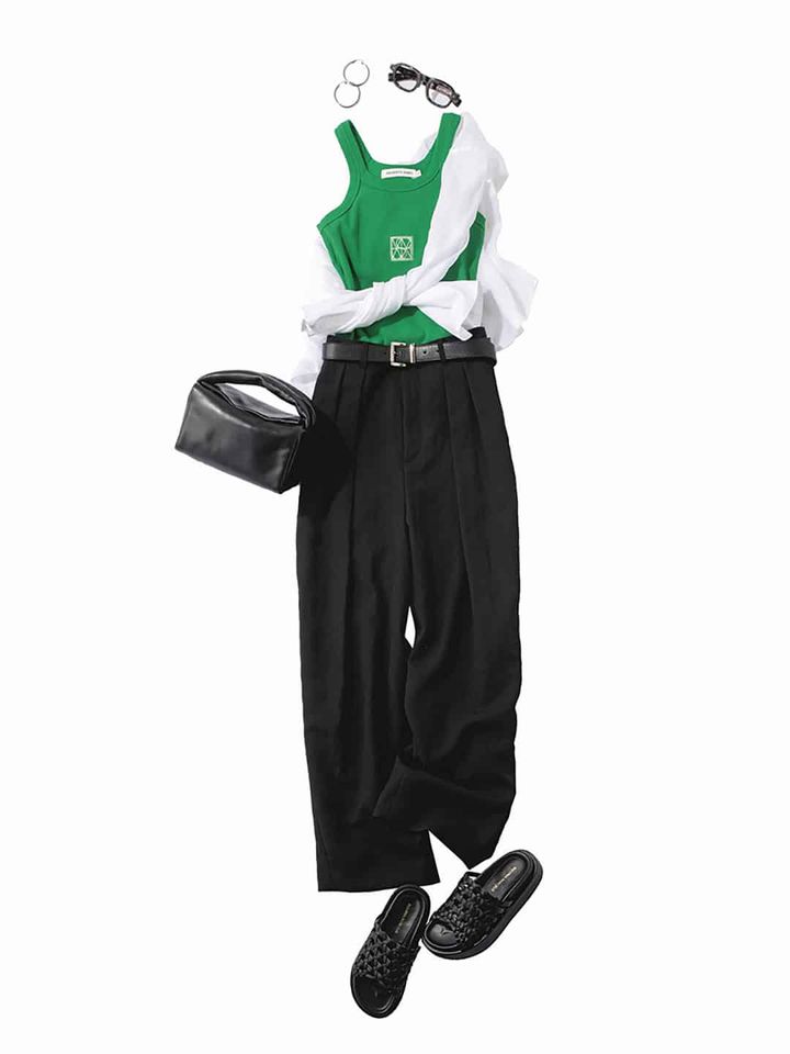 パンツ¥25,300(カレンソロジー/カレンソロジー二子玉川) タンクトップ¥13,200(アラミンタ ジェームス/ノーブル 有楽町マルイ店)シャツ¥12,100(Mila Owen/Mila Owen ルミネ新宿2店) ベルト¥15,400(アルアバイル)バッグ¥42,900(バケット バゲージ/アイネックス)サンダル¥59,400(パロマ バルセロ/アマン)ピアス¥4,830(アビステ)メガネ¥66,000(アイヴァン 7285/アイヴァン 7285 トウキョウ)