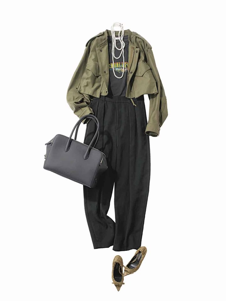 ブラックT~パンツを繋げてⅠラインを。そしてカーキで締めることで、秋へのシフトだけでなくスタイルアップ効果も。