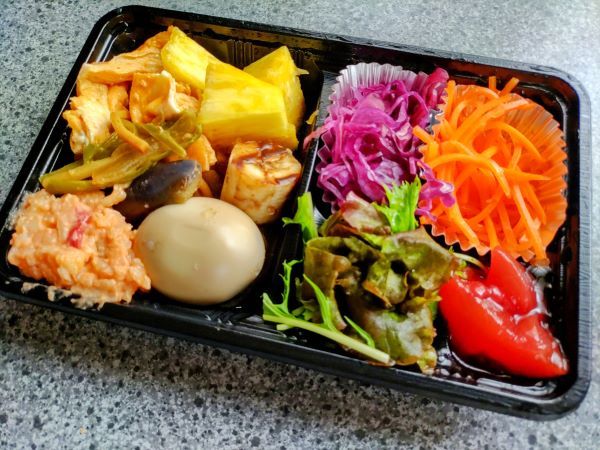 今回は、お惣菜を夕飯用にテイクアウト。ご飯は入れずに野菜と惣菜を中心に詰めてみました。店主おすすめの料理をおまかせで詰めてもらうこともできます。