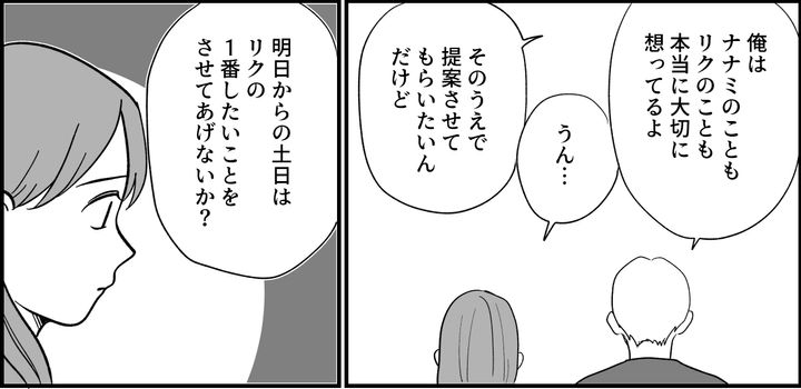 私は夫の提案を渋々了承しました。正直、この現状を少しでもいい方向に変えることができるのであれば……そんな希望がありました。リクに言いすぎたことを反省していたのもあったし、夫があまりに優しい顔で話してくるので、先ほどまで「誰も信じない」と思っていた気持ちが解けて、もう一度信じてみようと思ったのです。