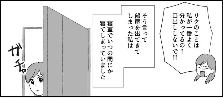 私(ナナミ)は、夫のタツヤと小学校3年生の息子、リクとの3人暮らし。息子は何ものにも代えがたい宝物です。しっかり育てて、立派な大人にしなければと、私はすべてを捧げてきました。しかし最近、リクは不登校に……。今はいつでも学校に戻れるように、勉強面のフォローを万全に整えています。そんな中、本人の希望で週3回、リクを義両親宅へ預けることに。しかしリクは義妹のハルナさんの家に行き、私がダメだと言い続けていたゲームで遊んでいたのです! 許せませんでした。義実家ぐるみで私を騙していたのです。しかも夫に至っては、私の気持ちに寄り添うどころか、義実家の人たちの肩をもつ始末……。私はもう何もかもが信じられず、疲れ切ってしまったのでした。