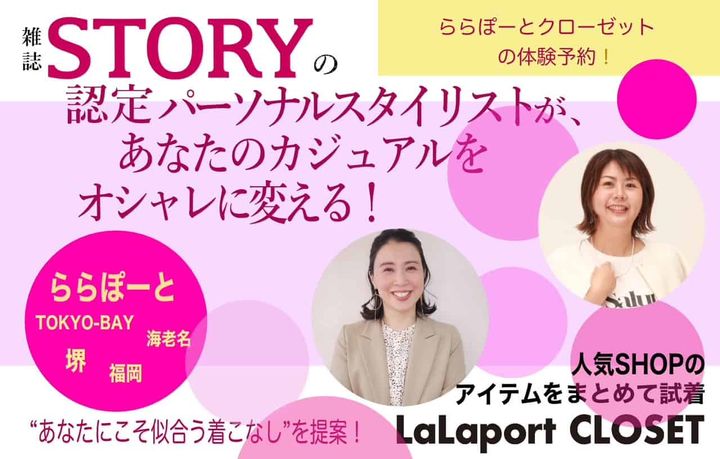 「STORYが街に出る!」をコンセプトにスタイリングサービスを行うイベントです。誌面でも活躍中のSTORY認定パーソナルスタイリストたちが、あなたの体型や雰囲気に合う服を探しながら、トレンドの着こなしをアドバイスします。会場はららぽーと内のさまざまなブランドの中から選りすぐりの旬を集めたセレクトショップ「LaLaport CLOSET」。気にいった服は、その場でららぽーとのECサイト〈&mall〉から購入できるので、手ぶらでSHOPPINGが楽しめます。