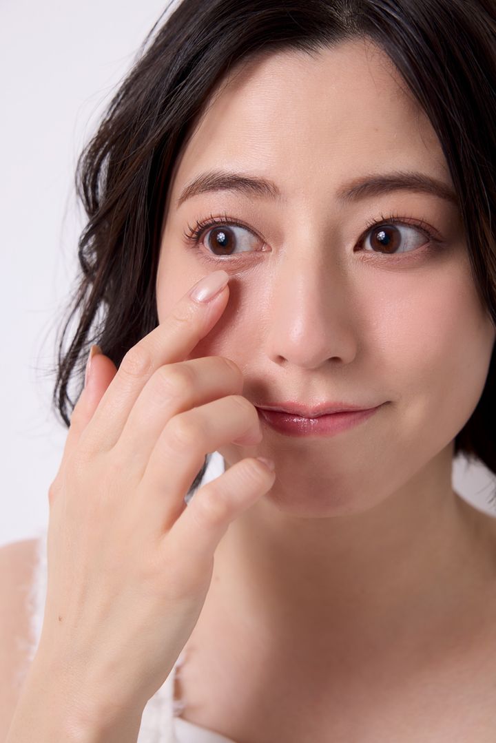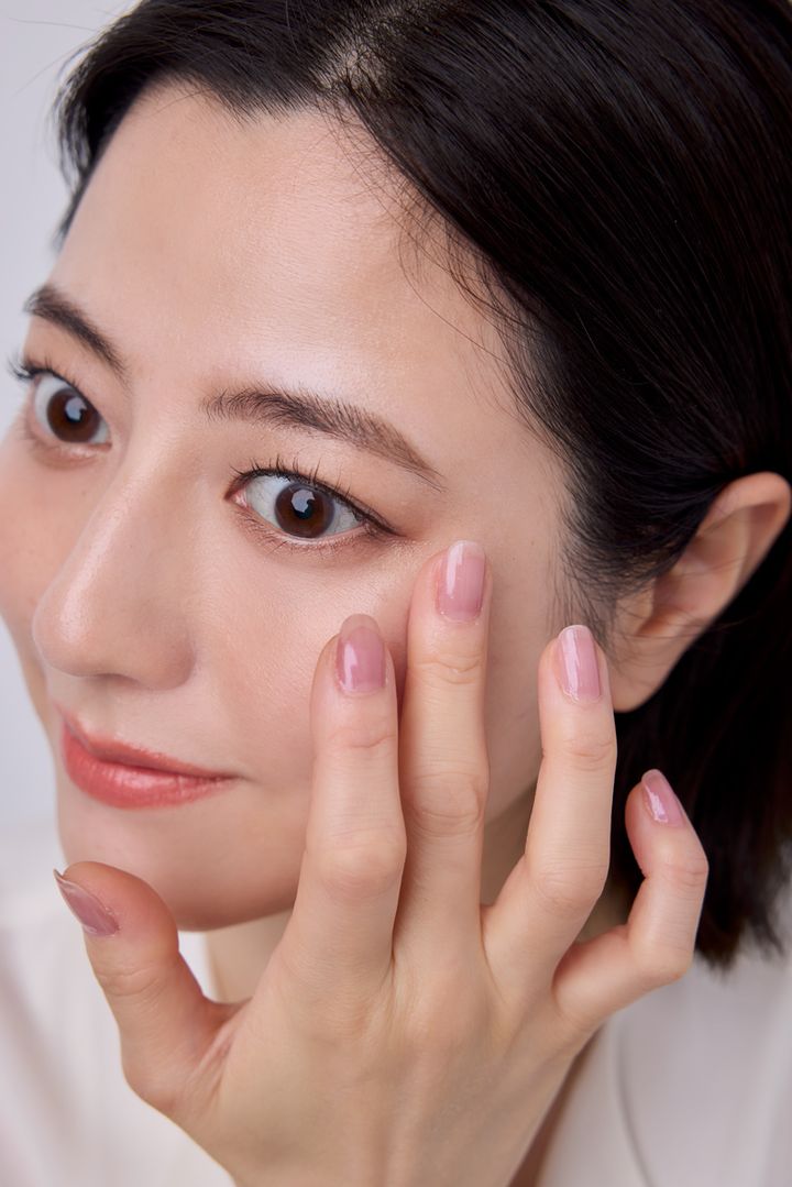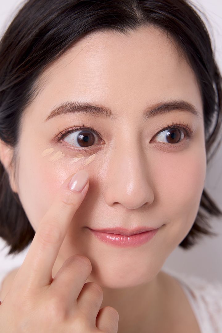 指先にとったリキッドハイライトをこめかみ、眉間など“年齢痩せ”が気になる部分に微調整しながらオン。光の効果で途端にふっくらとした表情になり、疲労感を払拭して新鮮な印象になります。