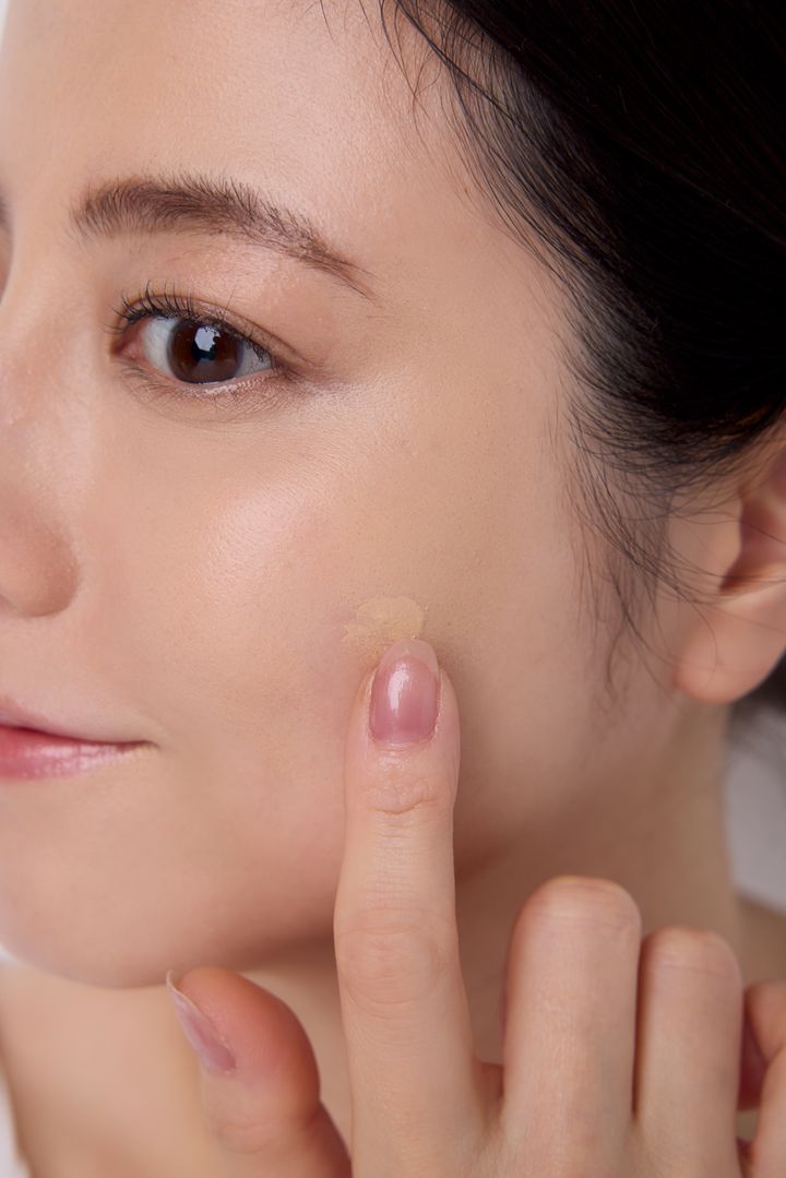シミ部分にコンシーラーをのせ、外側を指先でぼかしていきます。こうすることでコンシーラーが肌に馴染み、外側だけをぼかすことで“シミ透け”も防止。
