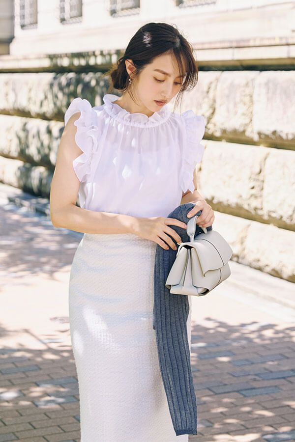 ノースリブラウス×ナロースカートの相乗効果ですらっとIラインを強調。