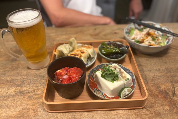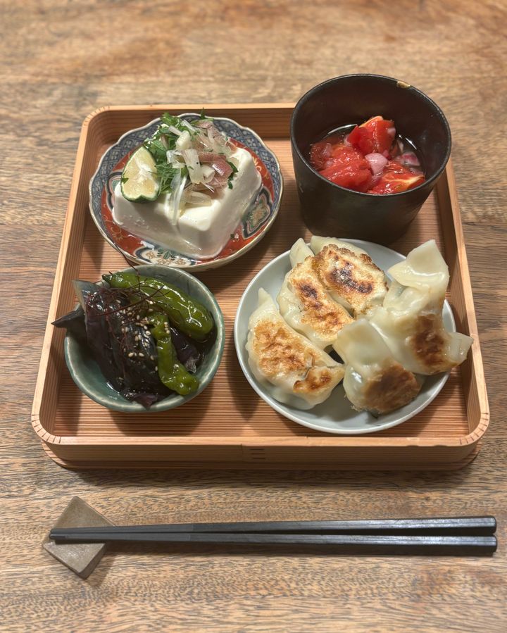 主人はちょこちょことおかずを楽しみたい派なので、夏野菜の煮浸しや冷奴、餃子にビールを添えて、夏らしい晩酌セットを作ってみました。左上のうつわは、私が一番最初に購入した古伊万里。いまでも一軍で登場する、大切な存在です。