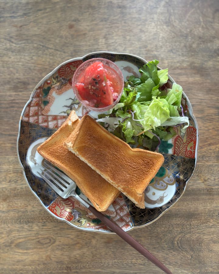 トーストにサラダといったごく一般的なモーニングも骨董の大皿に盛り付けて、変化球を。マリネしたトマトは味が混ざらないようにバカラのグラスに入れ、高低差を出すと見た目にも美しく、テーブル全体の印象がぐっと華やぐんです。