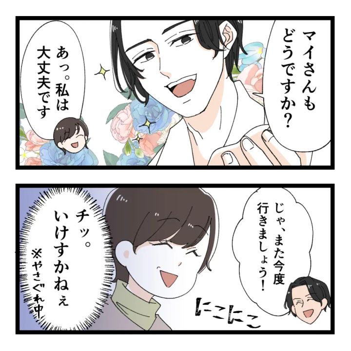さわやかイケメンは「マイさんもどうですか?」と誘ってきましたが、私は「あっ。私は大丈夫です」とにっこり笑顔でお断り。「じゃ、また今度行きましょう!」と笑顔で言うさわやかイケメンに、私は心の中で(チッ。いけすかねぇ)と毒を吐きました。そう、私・・絶賛やさぐれ中なのです。