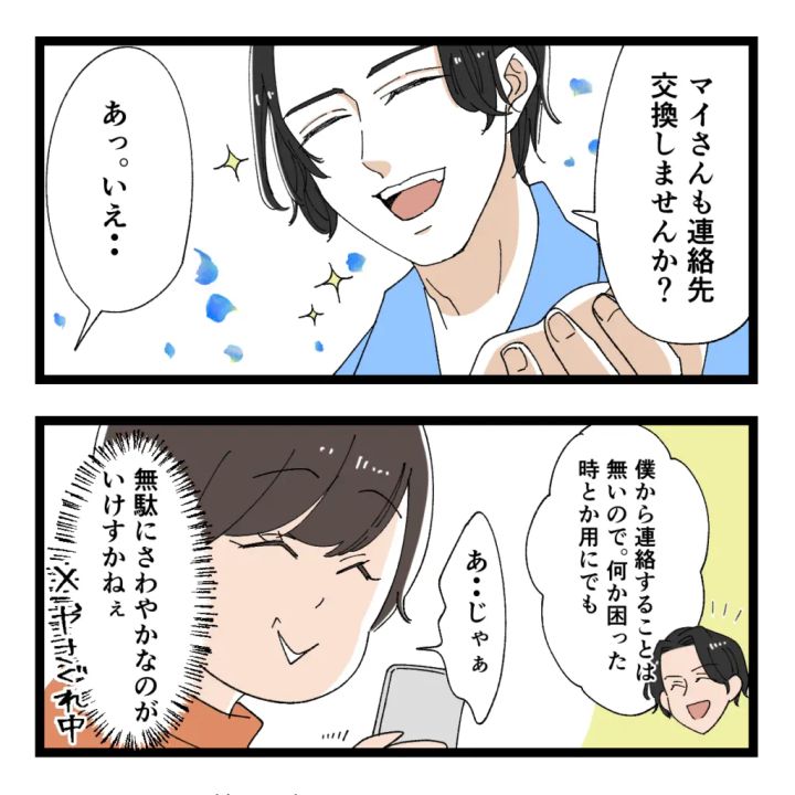 ある時、みんなが連絡先を交換していました。すると、さわやかイケメンが「マイさんも連絡先交換しませんか?」とにっこり。私は「あっ。いえ・・」と断ろうとしたのですが、「僕から連絡することは無いので。何か困った時とか用にでも」と言われ、断り切れず「あ・・じゃあ」と一応連絡先の交換をすることに。彼のそんなスマートな言動にも(無駄にさわやかなのがいけすかねぇ)と思ってしまうやさぐれ中の私でした。