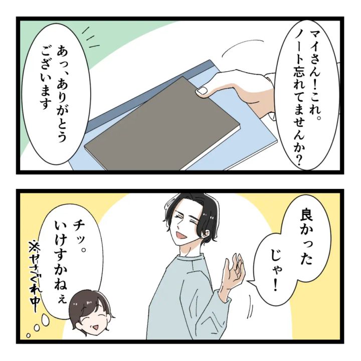 ある時、「マイさん!これ。ノート忘れてませんか?」と私が忘れていたノートに気付き手渡してくれたさわやかイケメン。お礼を言うと「良かった。じゃ!」と笑顔で去って行くさわやかイケメンを見て、やはり(チッ。いけすかねぇ)と思ってしまう私。