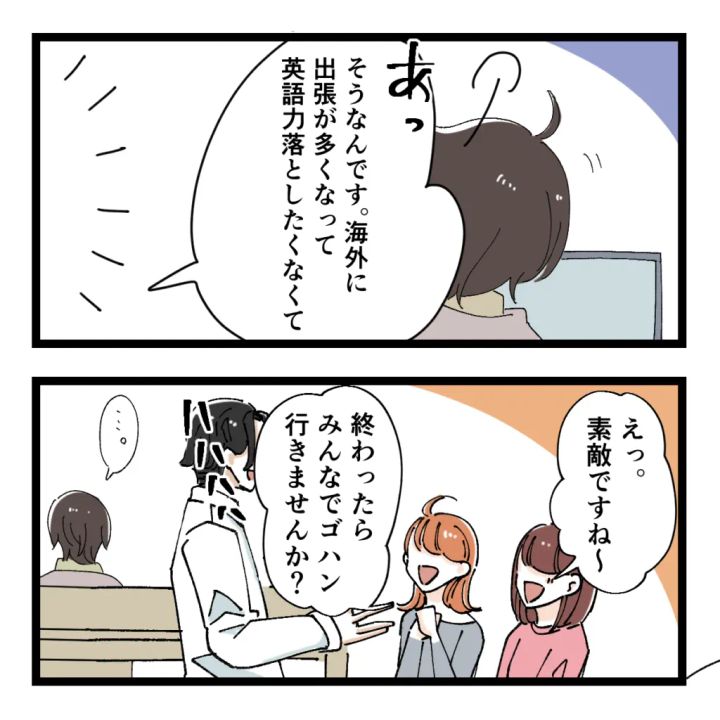 休憩時間も一人で勉強していると、「あっそうなんです。海外に出張が多くなって英語力落としたくなくて」という男性の話が耳に入って来ました。女性たちが「えっ素敵ですね~」とちやほやすると、男性が「終わったらみんなでゴハン行きませんか?」と誘っていました。ちなみに、私はこの男性のことを心の中でさわやかイケメンと勝手に呼んでいます。