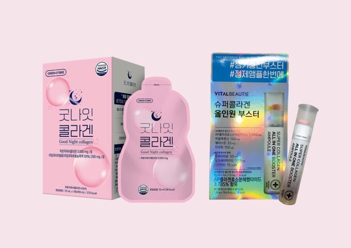 「錠剤とコラーゲンドリンクが一緒になったコラーゲンはQoo10でも買えます。独特な臭みが抑えられている感じ。夜用は魚由来の低分子コラーゲンが入ったドリンクで、1週間飲み続けるとぷるぷるに!」左・GREEN STORE Good Night collagen、右・アモーレパシフィック VITALBEAUTIE スーパーコラーゲンオールインワンブースターアンプルピル 8本 ¥3,722(編集部調べ)/ともにモデル私物