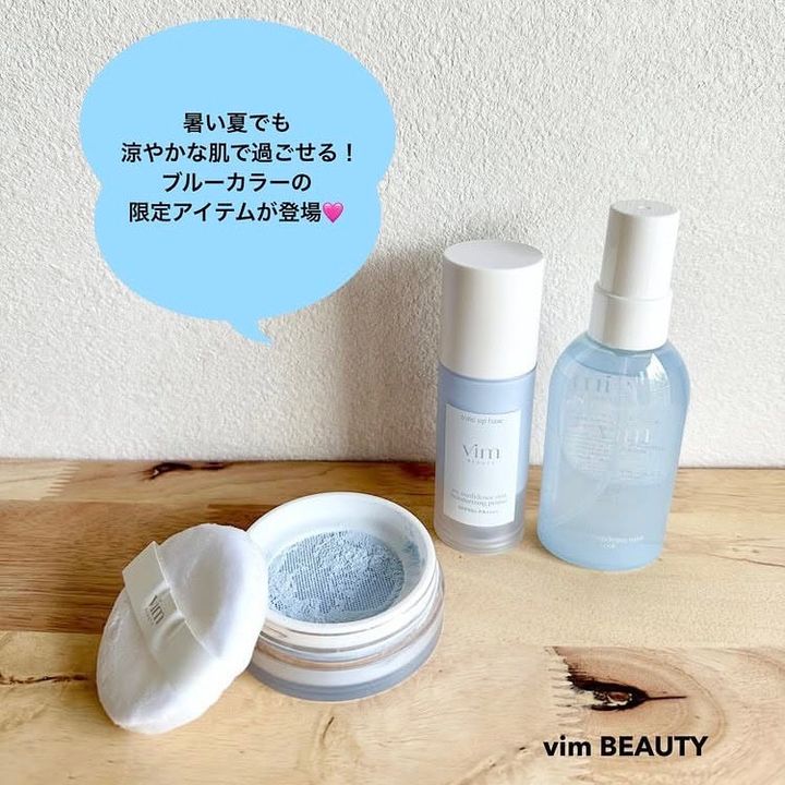 マイ コンフィデンス スキン モイスチャライジング プライマー スノウベール SPF50+・PA++++ 30mL ¥2,750(公式オンラインストア限定)、キープ コンフィデンス パウダー クリアブルー 6g ¥2,300※限定発売、キープ コンフィデンス ミスト クール 80mL ¥1,650※限定発売(全てvim BEAUTY)