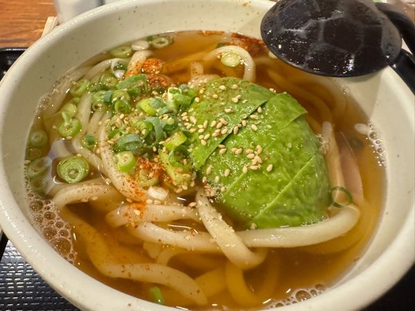お好みでゴマ、七味といった薬味をプラスしていただきました。まろやかなアボカドが、化学調味料不使用の丁寧に引いたお出汁と見事に調和し、ヘルシーながらも満足感たっぷりの味わいです。