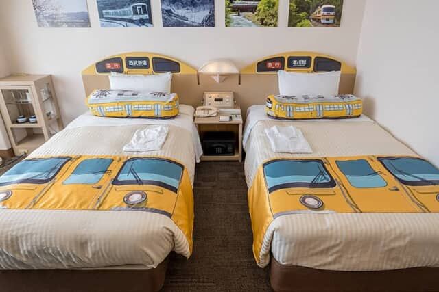 1日1部屋限定のシミュレータルームは、客室タイプ「ツインルームB」を使用。西武鉄道の黄色い電車として愛されてきた2000系の装飾が施されています。壁には鉄道旅行を体験できるように、なつかしい電車や駅の写真が飾られるほか、鉄道ファンなら感動の様々な装飾がほどこされています。※10月以降は客室の装飾が一部変更になります。