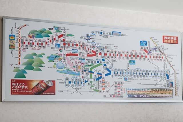 ▲西武鉄道の昔の路線案内図も飾られています