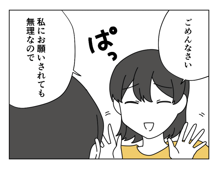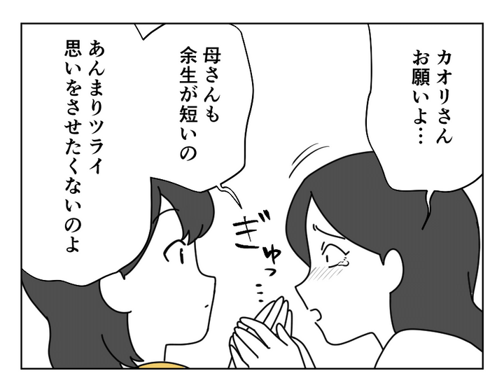 義姉のところも同じくカツカツのようで、1万円を2万円に増やすとかなりの負荷になる様子。それだけでなく、「きょうだいなのに負担が平等でない」というところに納得がいっていないようです。「財布の紐を握っているのはカオリさん」だと知っている義姉は、同情を誘うかのようにすがりついてきました。しかし義姉にここまでされても、カオリさんの意思は揺るがないようです。
