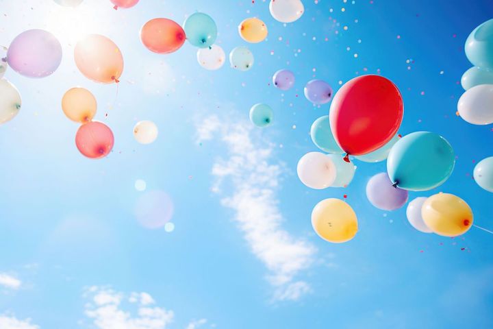 Multicolored balloons with helium on a blue sky