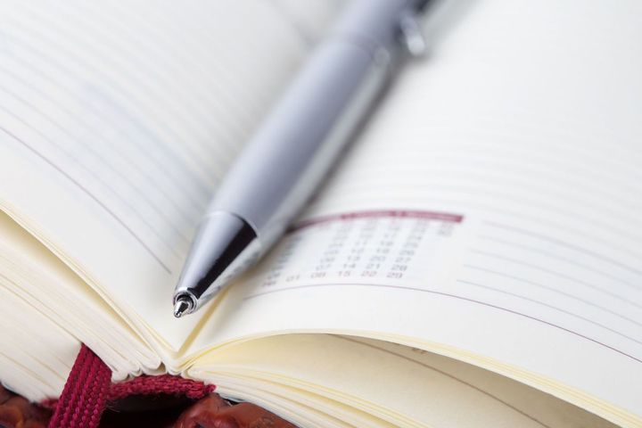 Detail of an open red diary with pen