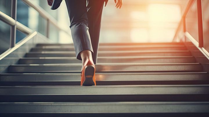 a modern businesswoman's legs as she confidently climbs a staircase in the heart of a bustling city. ample space around the image for text describing her determination and ambition.
