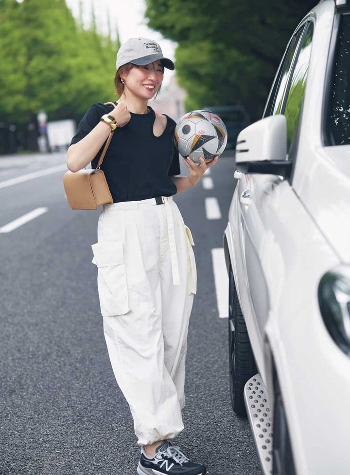 シルエットにひねりの効いたパラシュートパンツに、ニューバランスのスポーティな一足で軽快カジュアルに。夏に増えるワンツーコーデも洗練!肌見せトップスもヘルシーにカジュアルダウン。