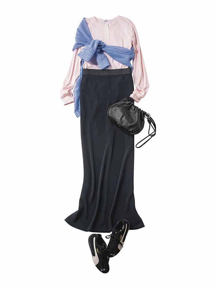 ピンクとタイトスカートの上品カジュアルには、プーマのレトロなデザインの一足がフィット。