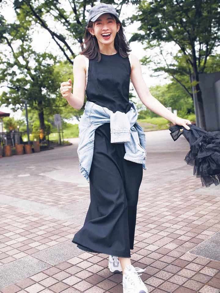 ワンピース¥25,300(ミースロエ) デニムジャケット¥67,600(エーゴールドイー/シチズンズ・オブ・ヒューマニティ)タンクトップ¥15,400(プランクプロジェクト/プランクプロジェクト 青山店)バッグ¥7,480(バーセルフ)スニーカー¥19,800(ニューバランス/ニューバランスジャパンお客様相談室)キャップ¥5,500(グッドスピード)ピアス¥79,200※片耳価格(プライマル)