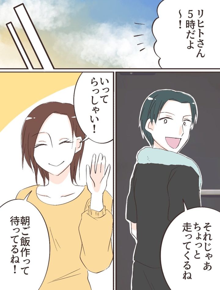 「リヒトさん5時だよ~!」5時になるとリヒトさんを起こし、「それじゃあちょっと走ってくるね」と家を出るリヒトさんを「行ってらっしゃい!朝ごはん作って待ってるね!」と笑顔で見送ります。