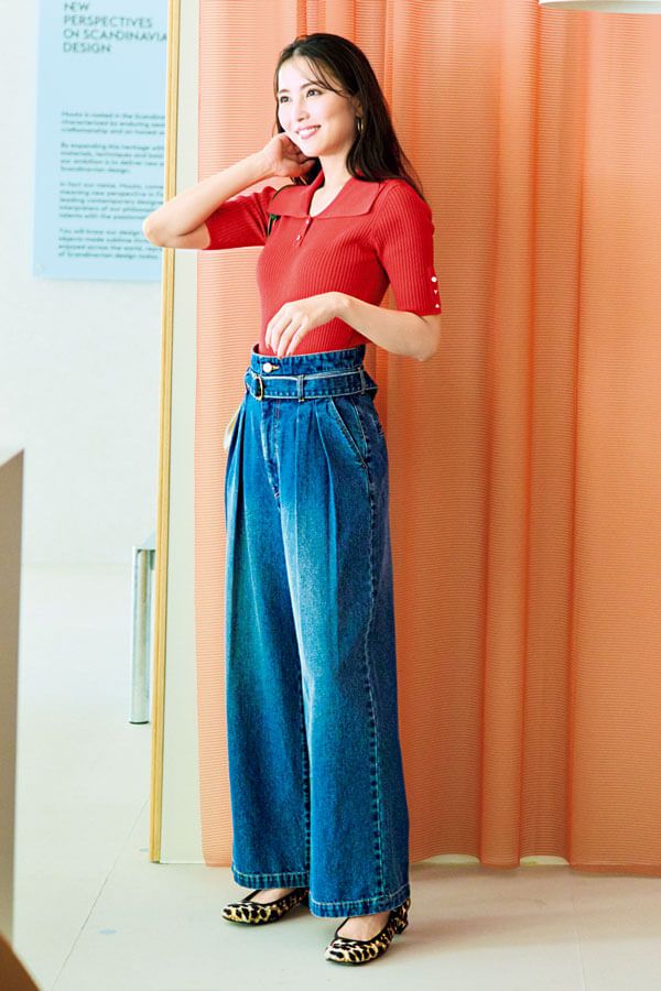 「ハイウエストなタックデザインでワイドシルエットもすっきりとした印象にみせてくれるデニム。 ベルト付きデザインできちんと感もプラス!」(プレス 辻村さん)