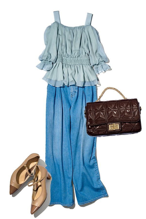 夏らしいさわやか配色のデニムコーデを、ブラウン系のレザー小物合わせでしっとり秋のムードに寄せて。