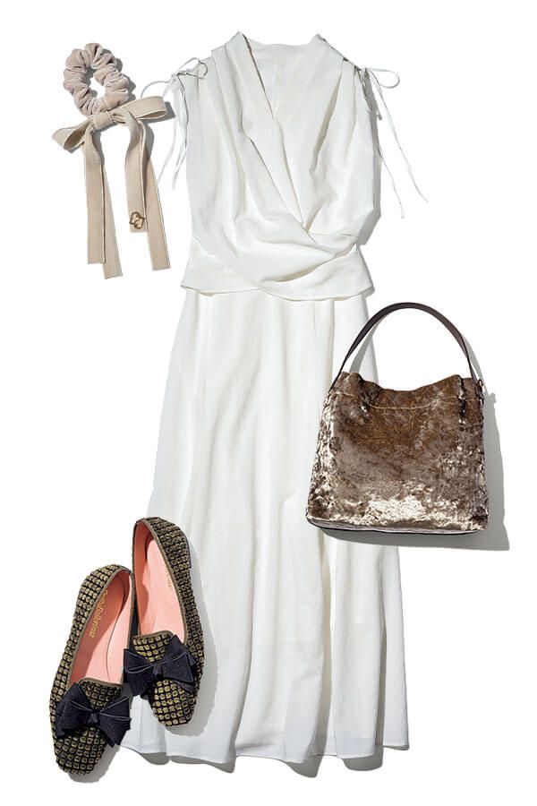 服と小物の異素材ギャップを強調すると、コーデの洗練度がアップ♡ バッグとシューズに加えてヘアアクセでもベロアを追加し、涼やかな白ワンピを秋風情に着こなして。