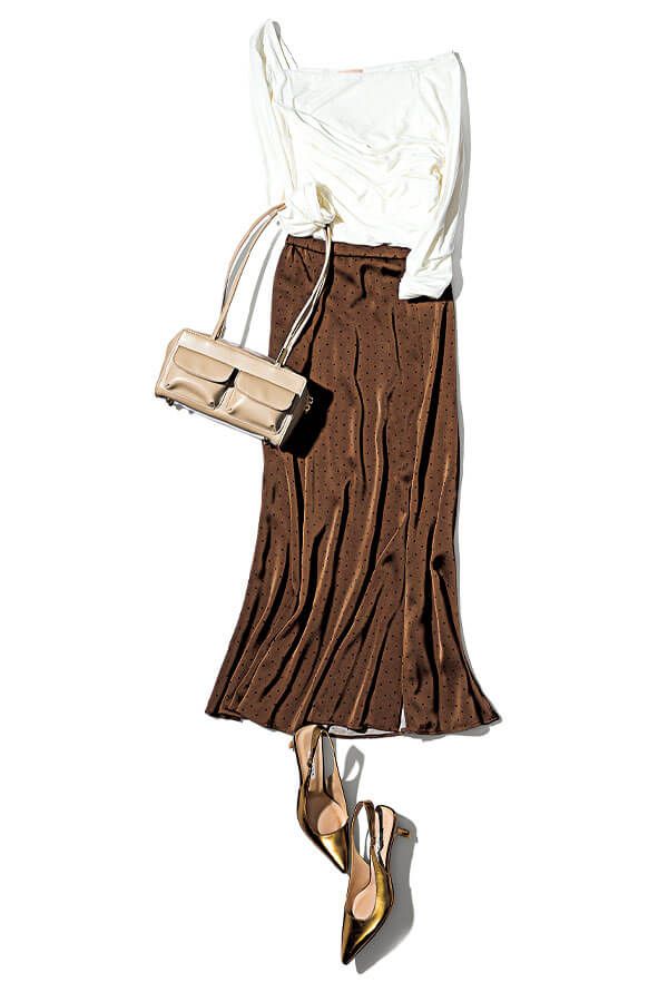 さりげないデコルテ見せが色香抜群。光沢スカートで女っぽさを増幅させて、晩夏の夜に映えるデートスタイルを演出。
