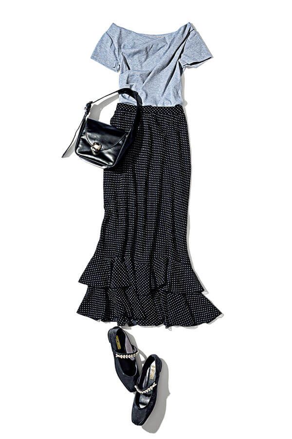 カットソー¥1,099/GRL ドット柄スカート¥12,100/ココ ディール バッグ¥8,800/カカトゥ(アンビリオン) パンプス¥24,200/ダニエラアンドジェマ