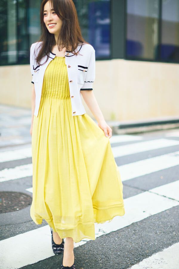 「〝この人、素敵〟と思われる印象作りには、カラーとシルエットの力を借りるのがポイントです。明るめのカラーは、表情をふんわり柔らかく見せてくれる魔法のようなもの。顔まわりに優しいトーンを持ってくることで、たとえ表情が乏しくても明るい印象を相手に与えることができます。特におすすめなのは、パステルカラーやマカロンカラー。写真のコーディネートのような華やかなレモンイエロー・ロイヤルブルーはとても素敵ですね。そしてもうひとつのポイントは、ウエストマークされた美しいシルエット。スタイルアップ効果はもちろん、女性らしい印象を与えることができるから、婚活シーンでも好感度バツグンです。服装が整うと、自然と背筋が伸びて、笑顔も自信もわき出てきます。ファッションの力を借りて、『また会いたい』と思われるレディを目指しましょう」