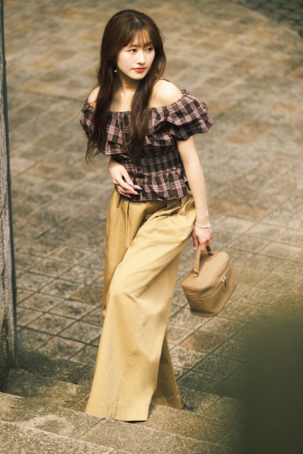 「関係が安定してきた3回目・4回目のデートは、〝甘さ控えめ〟が好印象。スカートやワンピースが定番だった人も、ここでパンツスタイルに切り替えると、いいギャップが生まれます。たとえば、写真のようなボリュームのあるトップス×すっきりパンツのコーディネート。胸元をあまり出しすぎないように意識すれば、カジュアルなシーンでも上品さはキープできます。ドライブデートなど動きやすさが求められる日でも、スカートがドアに挟まる心配もなく、スマートな印象に。トップスにチェック・ドット・花柄などのさりげないフェミニン要素を取り入れれば、パンツスタイルでも女性らしさは十分に表現できます」