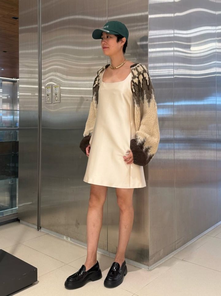 「キレイめなミニ丈のワンピースにノルディック柄のカーディガンを羽織り、SCHOOL×AMERICANなムードに。ブラウンのアイテムで秋冬の気分も取り入れながらスタイリングしました」