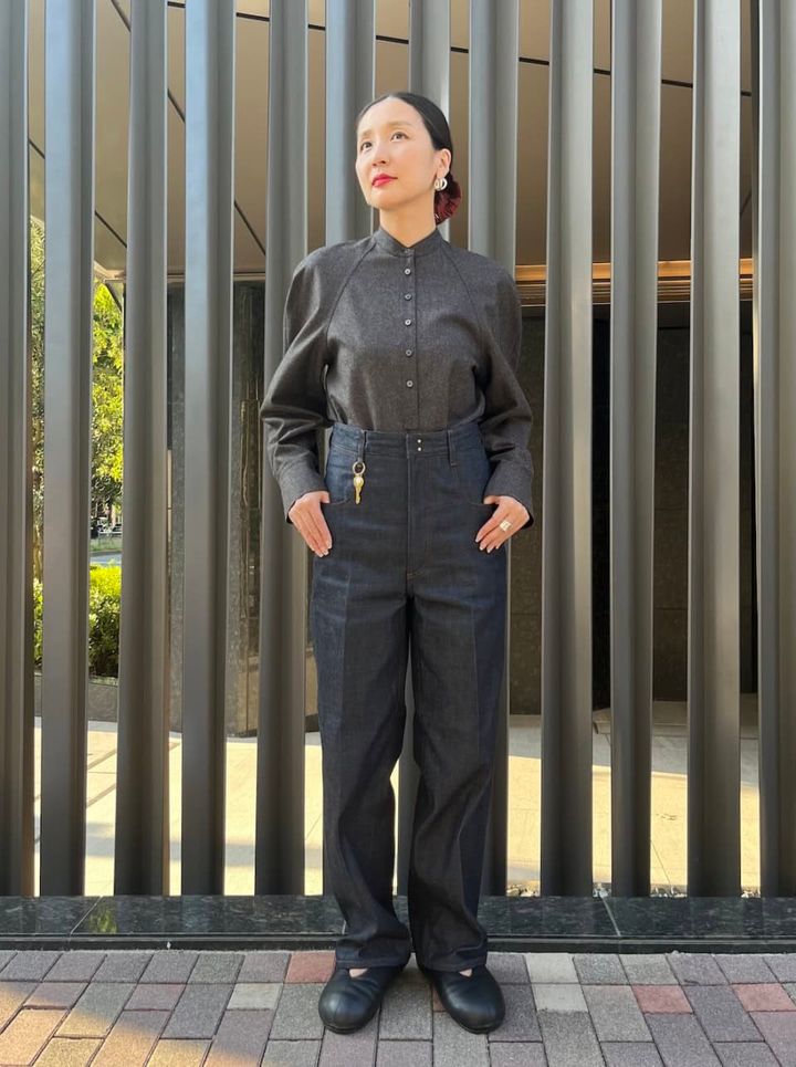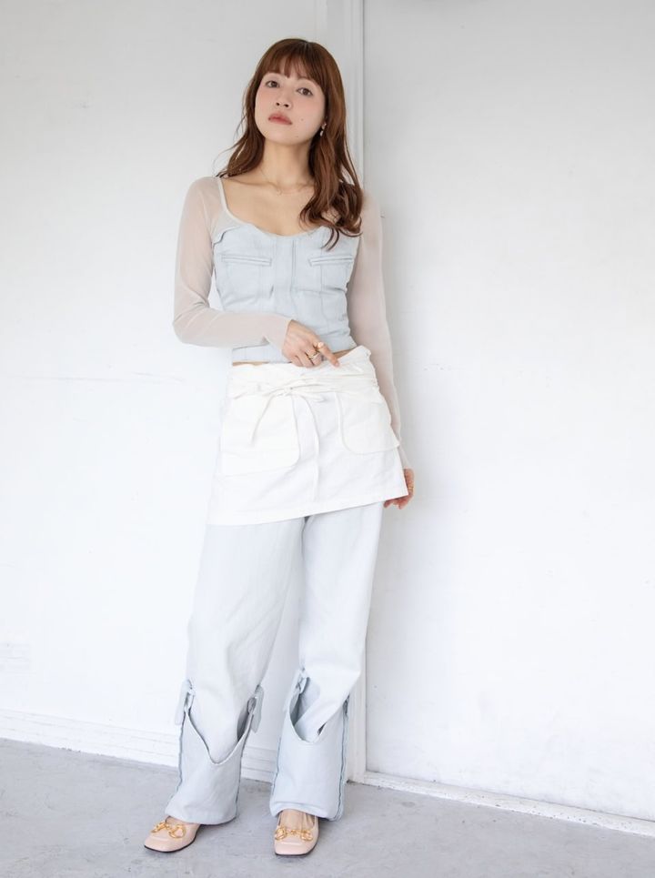 「デニムが好きなのですがカジュアル一辺倒にならないように、ヌケ感や女性らしさを取り入れるように意識しています。シアーな素材やビスチェなどディテールでほんのり甘さをプラス。トップスやボトムはレイヤードすることでトレンド感も取り入れたスタイリングに仕上げました」