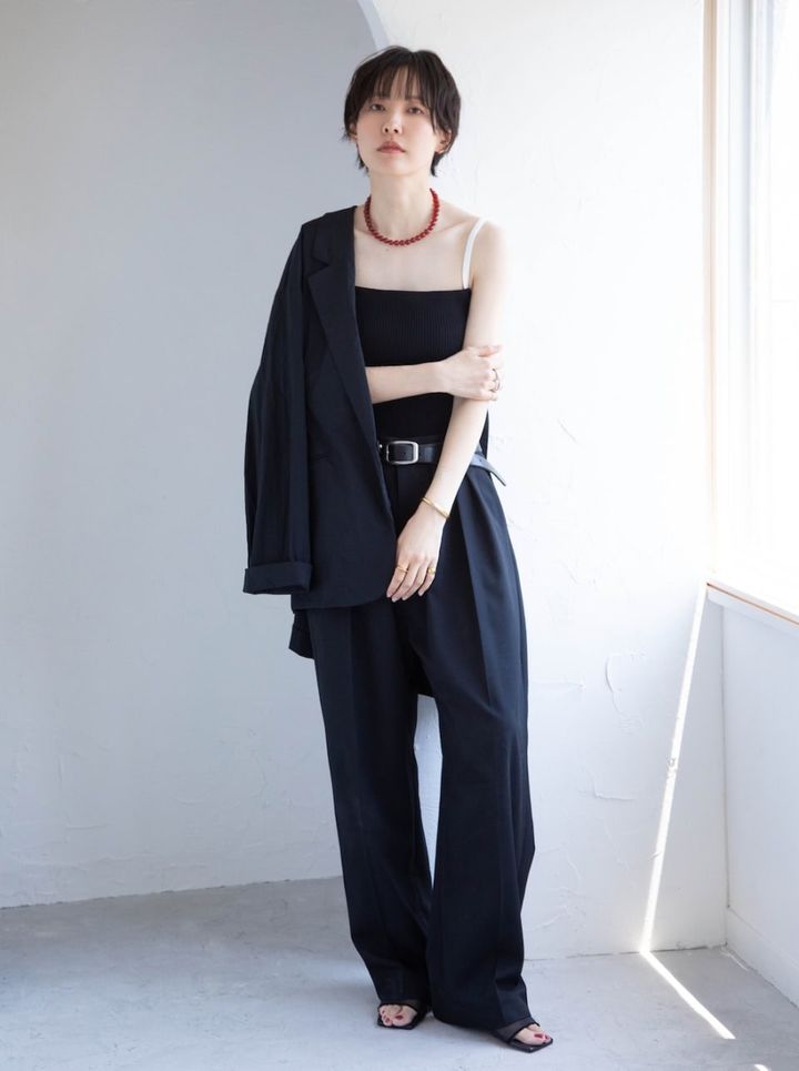 「軽やかな素材感で楽しむ夏のブラックスタイル。ミニワンピ丈のトップスに上品なパンツを重ねた着こなしが、今年っぽさを後押ししてくれます。シンプルなスタイリングを生かし、存在感のあるジュエリーを取り入れてアクセントになるようバランスを意識しました」